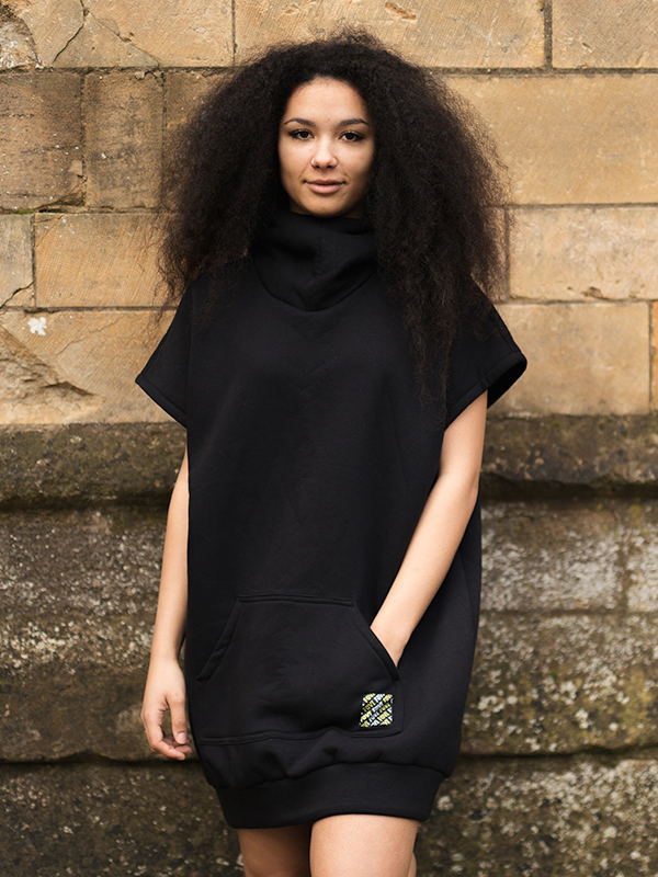 The long blackout sleeveless Hoodie dress is made is made from a rich sweat shirting fabric. Featuring a raised, soft fleece style inside to give it a lovely warm, soft and comfortable feel. in our classic relaxed fit. The logo is stitched on by hand.